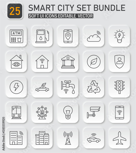 Collection of 25 Neumorphism style Smart City technology vector icon set bundle