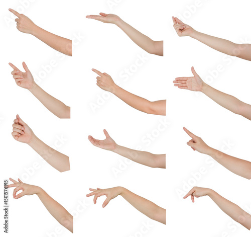 Collection of a hands with different sign, hold, pointing, touch, peace and more