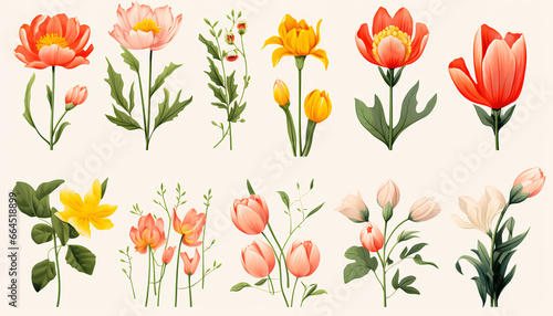 Collection of beautiful Japanese flowers and nature elements, set of various types of Lotus, Yellow Tulip Akaichurippu, Tsubaki on isolated background