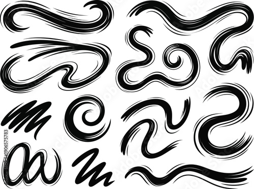 Collection of black hand-drawn brush stroke elements displays various dynamic swirling and wavy abstract shapes.