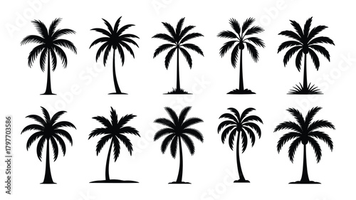 palm tree, silhouette, tropical, tree, nature, plant, vector, illustration, isolated, white background, summer, travel, vacation, beach, island, palm, coconut, foliage, leaf, trunk, vegetation, flora, organic, growth, design, element, graphic, icon, symbol, collection, set, variety, different, shape, size, style, exotic, green, landscape