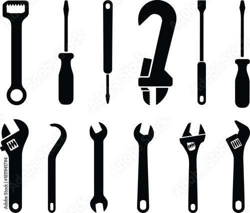 Collection of black silhouettes featuring construction hand tools, wrenches, screwdrivers, and spanners, isolated on white background for repair