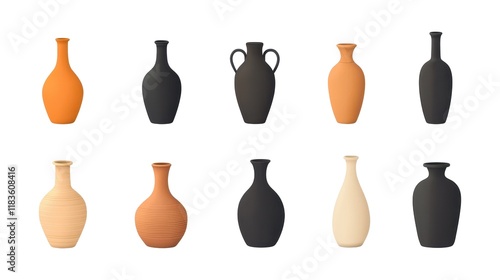 Collection of ceramic vases in various shapes and colors, Isolated on White Background Cutout