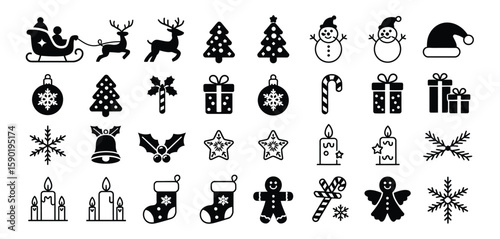 christmas, icon, symbol, holiday, winter, decoration, celebration, vector, illustration, design, graphic, clip art, set, collection, santa, sleigh, reindeer, snowman, christmas tree, gift, present, ornament, snowflake, bell, holly, star, candle, stocking, candy cane, hat, angel, festive, traditional