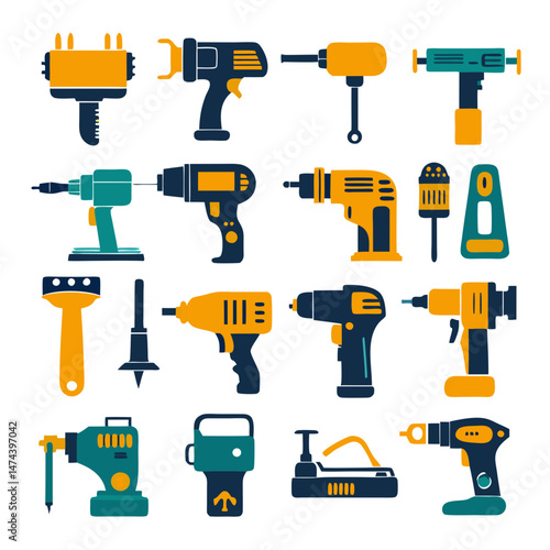 drill, tool, equipment, construction, repair, building, industry, electric, screwdriver, work, hammer, wrench, set, collection, flat, design, isolated, vector, icon, graphic, illustration, hardware, instrument, maintenance, machinery, orange, teal, white background, assortment, variety, pattern, repetitive, arrangement, toolbox, handyman