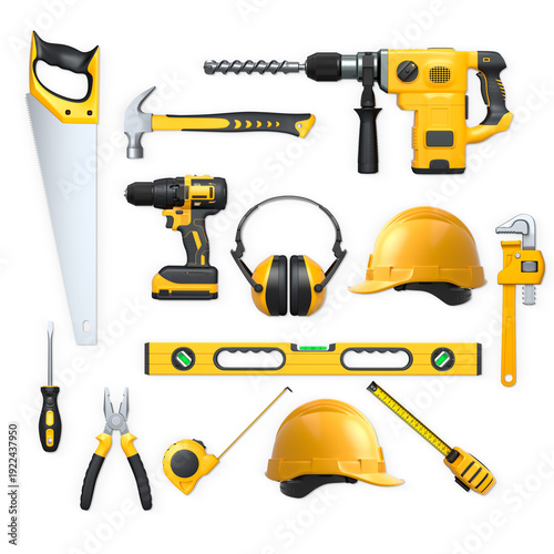 tool, construction, helmet, collection, safety, gear, equipment, hammer, wrench, screwdriver, plier, level, tape, clipping, path, earmuffs, protection, building, repair, maintenance, engineering, hard hat, men at work, industrial, workshop, manual, labor, craftsman, carpenter, electrician, mechanic, hardware, measuring, background, isolated, hand-held, hard-wearing, utility, instrument, accuracy, ergonomic, professional, secure, performance, white, work, industry