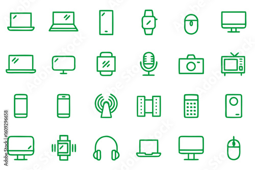 Collection of contemporary digital technology and computing concepts presented as clean modern outline graphics for various applications