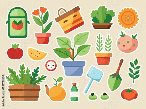 gardening, sticker, plant, vegetable, fruit, tool, garden, cute, bucket, watering can, tomatoes, melon, flower, leaf, germinating, pot, shovel, germ bud, organic, harvest, agriculture, botany, flora, illustration, clip art, icon, graphic, element, design, vector, nature, healthy, food, garden tool, growing