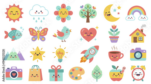 cute, cartoon, icon, illustration, sun, moon, nubes, cloud, rain, flower, tree, butterfly, bird, fish, house, mountain, star, light bulb, rocket, hot drink, camera, gift, bag, plant, alarm, clock, rainbow, happy, smiling, face, character, drawing, vector, art, design, graphic, element, sticker, set, collection, childish, playful, whimsical, adorable, sweet, simple, flat, modern