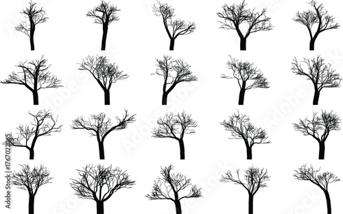 Collection of diverse bare winter trees silhouettes isolated for artistic and design projects