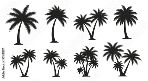 Collection of diverse black silhouettes of palm trees, showcasing various arrangements and sizes against a white background.