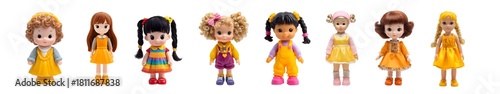 doll, toy, children, girl, figure, plastic, play, collectable, character, cute, fashion, outfit, hair, style, group, set, collection, display, white, background, studio, shot, isolated, small, miniature, person, children, female, adorable, sweet, joyful, happy, bright, colourful, orange, yellow, purple, brown, black, blond, curly, straight, ponytail, braid, short, long, dress, overall, shirt
