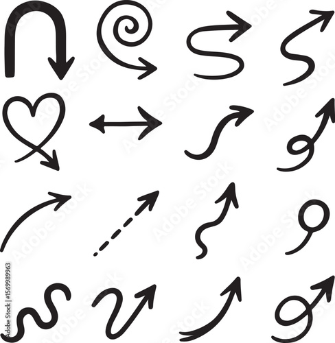 Collection of diverse hand drawn black arrows and symbols on a white background representing direction and movement