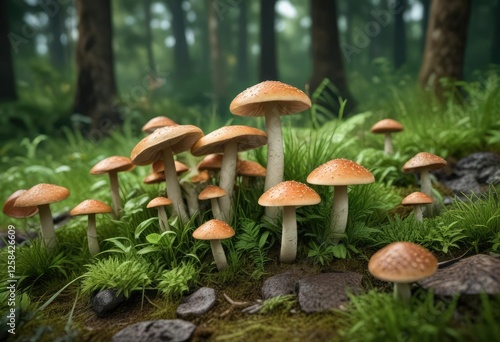 Collection of diverse mushrooms surrounded by lush green grass at the forest base, mushroom mania, variety of fungi