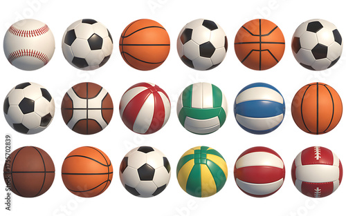 Collection of diverse sports balls arranged in rows for athletic enthusiasts isolated on transparent background