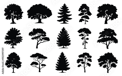 Collection of diverse tree silhouettes in black on white background for design and decoration purposes