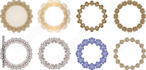 circular, frame, decorative, ornate, intricate, pattern, design, border, vintage, antique, gold, brown, blue, floral, lace, mandala, round, embellishment, graphic, element, art, craft, textile, cut-out, filigree, scrollwork, symmetric, ornamental, traditional, elegant, classic, detailed, collection, set