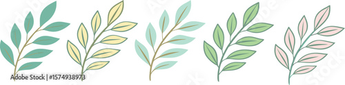 Collection of five delicate botanical branches with leaves in soft pastel colors on a white background