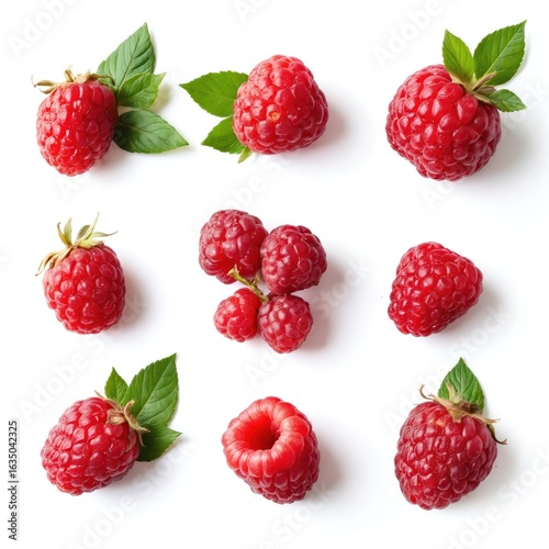 Collection of fresh raspberries with green leaves presented on white background. Vibrant red berries showcase textured surface, natural shapes. Berries whole, one displays hollow center. Assortment