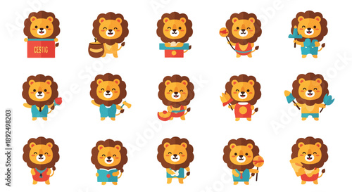 set, zoo, lion, cute, book, wand, children, pose, funny, honey, magic, happy, animal, design, nature, mascot, jungle, cartoon, costume, musical, playful, children, wildlife, adorable, cheerful, isolated, character, instrument, collection