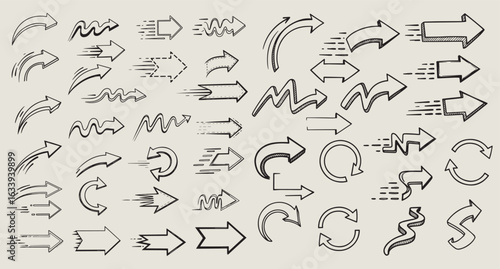 Collection of hand drawn doodle arrows and directional symbols in black ink on a textured cream background