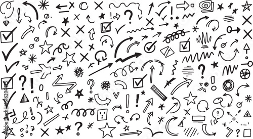 Collection of hand drawn doodle arrows and symbols isolated on transparent background