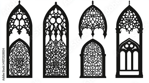 Collection of Islamic window silhouettes in black featuring Arabic architectural frames with traditional designs