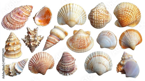 Collection of Isolated Seashells on a Bright White Background Showcasing the Unique Shapes, Textures, and Patterns of Various Marine Species in High Resolution