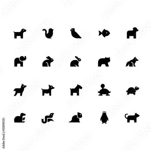 black-and-white, minimalist, simple, vector graphics, dog, cat, bird, fish, elephant, rabbit, bear, fox, puppy, turtle, penguin, illustration, graphic design, monochrome, silhouette, wildlife, pet, fauna, simple icons, white background