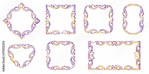 frame, ornate, decorative, border, design, element, graphic, illustration, vintage, antique, elegant, luxury, art nouveau, baroque, rococo, filigree, swirl, curl, scroll, floral, leaf, pattern, abstract, purple, gold, pink, watercolor, paint, gradient, isolated, white background, cut-out, clip art, set, collection, group, square, rectangle, oval, diamond, geometric, invitation, greeting card, scrapbooking, photo frame, picture frame, label