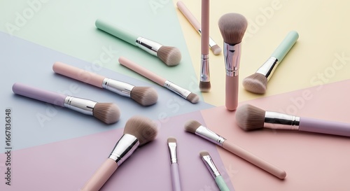 Collection of Pastel Makeup Brushes on a Multi-Colored Soft Background for Beauty and Cosmetics