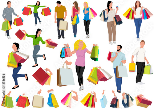 Collection of People Carrying Shopping Bags with Purchases - Colorful Set for Your Graphic Projects, Vector Illustration