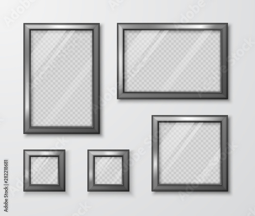 Collection of photo frames on the gray wall. Modern empty frame template with transparent glass and shadow. Vector illustration
