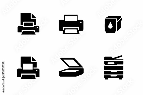 printer, scanner, copier, icon, silhouette, ink, paper, device, machine, technology, print, scan, copy, toner, black, equipment, symbol, office, document, network, classic, modern, digital, multifunction, media, laser, supply, hardware, peripheral, stack, sheet, vector, icon
