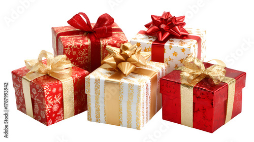 Collection of red, white, and gold glossy Christmas gift boxes isolated on white background