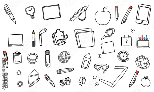 school, supply, stationery, pen, notebook, apple, education, back to school, creativity, learning, classroom, tool, writing, drawing, organisation, art, design, vignetting, marker, eraser, folder, paper, ruler, highlighter, clipboard, globe, calculating machine, note, sketchbook, inspiration, study, student, teaching, doodle, illustration, craft, office, workspace, accessory, planner, idea, imagination, fun, colourful
