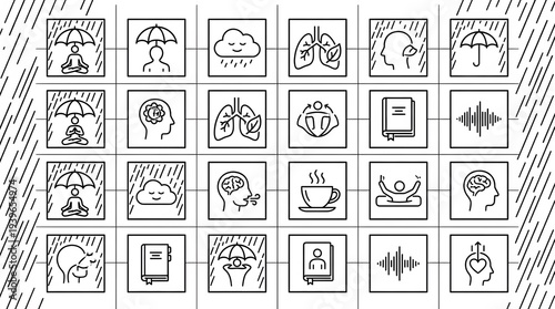 icon, line, simple, app, symbol, set, grid, black, white, umbrella, cloud, lung, light bulb, phone, target, brain, cup, hand, chart, signal, power, vignetting, illustration, design, user, interface, mobile, application, concept, object, style, art, minimal, modern, clean, flat, vector, graphic, symbolic, representation, idea, abstract, technology, communication, device, media, social, network
