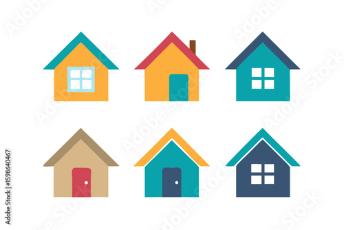 house, home, building, architecture, colourful, cartoon, illustration, vector, icon, design, simple, minimalist, graphic, art, drawing, concept, real estate, property, residential, neighbourhood, village, bungalow, dwelling, shelter, roof, window, door, blue house, red door, black background, isolated, set, collection