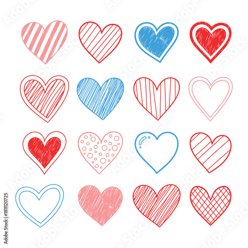 Collection of sixteen hand-drawn hearts with various patterns and colors.