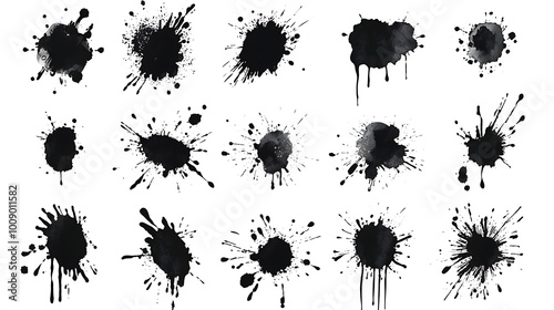 Collection of small black ink splats on full white background background