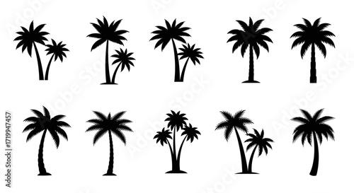 Collection of stylized black palm tree silhouettes, varying in size and arrangement.