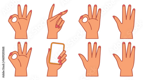 hand, gesture, illustration, flat, stylised, collection, ok, finger, pointing, holding, phone, smartphone, touch screen, communication, technology, digital, female, woman, nail, manicure, pink, peach, skin, tone, graphic, icon, symbol, signs, body, part, limb