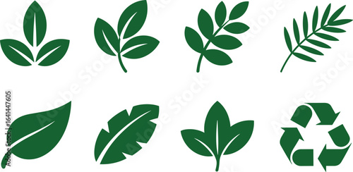 Collection of stylized green leaf illustrations and a recycling symbol on a white background representing nature and sustainability