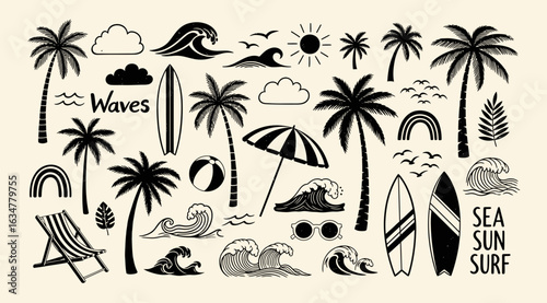 Collection of summer beach icons including palm trees, waves, surfboards, sun, and rainbows, perfect for vacation and travel themes
