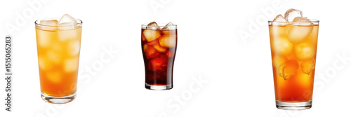 Collection of Three Iced Beverages in Transparent Glasses Featuring a Light Tea Drink, a Dark Brown Soda, and an Orange Drink with Ice on a transparent Background