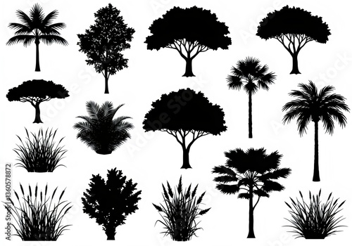 silhouette, tree, plant, foliage, nature, botanical, flora, black-and-white, shadow, leaf, branch, trunk, greenery, landscape, environment, garden, forest, park, growth, vegetation, natural, scenic, design, illustration, art, graphic, wild, tropical, exotic, diverse, variety, species, plant, vector, tree branch, pattern, set