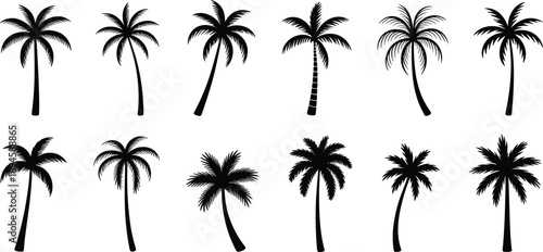 Collection of tropical palm tree silhouettes isolated on transparent background