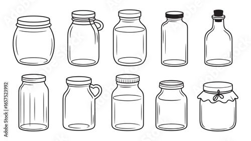 glasses, jar, canning, container, bottle, vintage, collection, assortment, variety, shape, size, storage, food, preservation, illustration, vector, line art, drawing, outline, design, blank, empty, handle, cork, stopper, lid, decorative, art, bricolage, project, clean, black, white, isolated, template, element, object