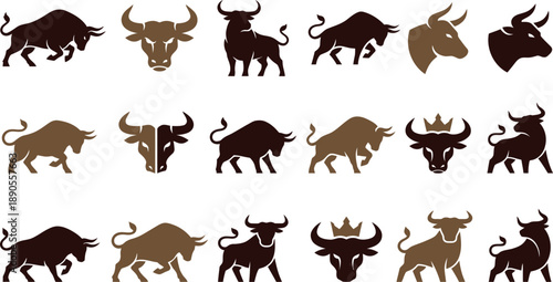 Collection of various bull silhouettes in different poses and colors, vector graphics, animal designs, multiple views, illustration style