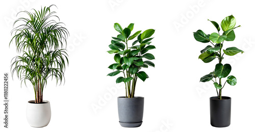 Collection of various indoor plant in pots isolated on transparent background.